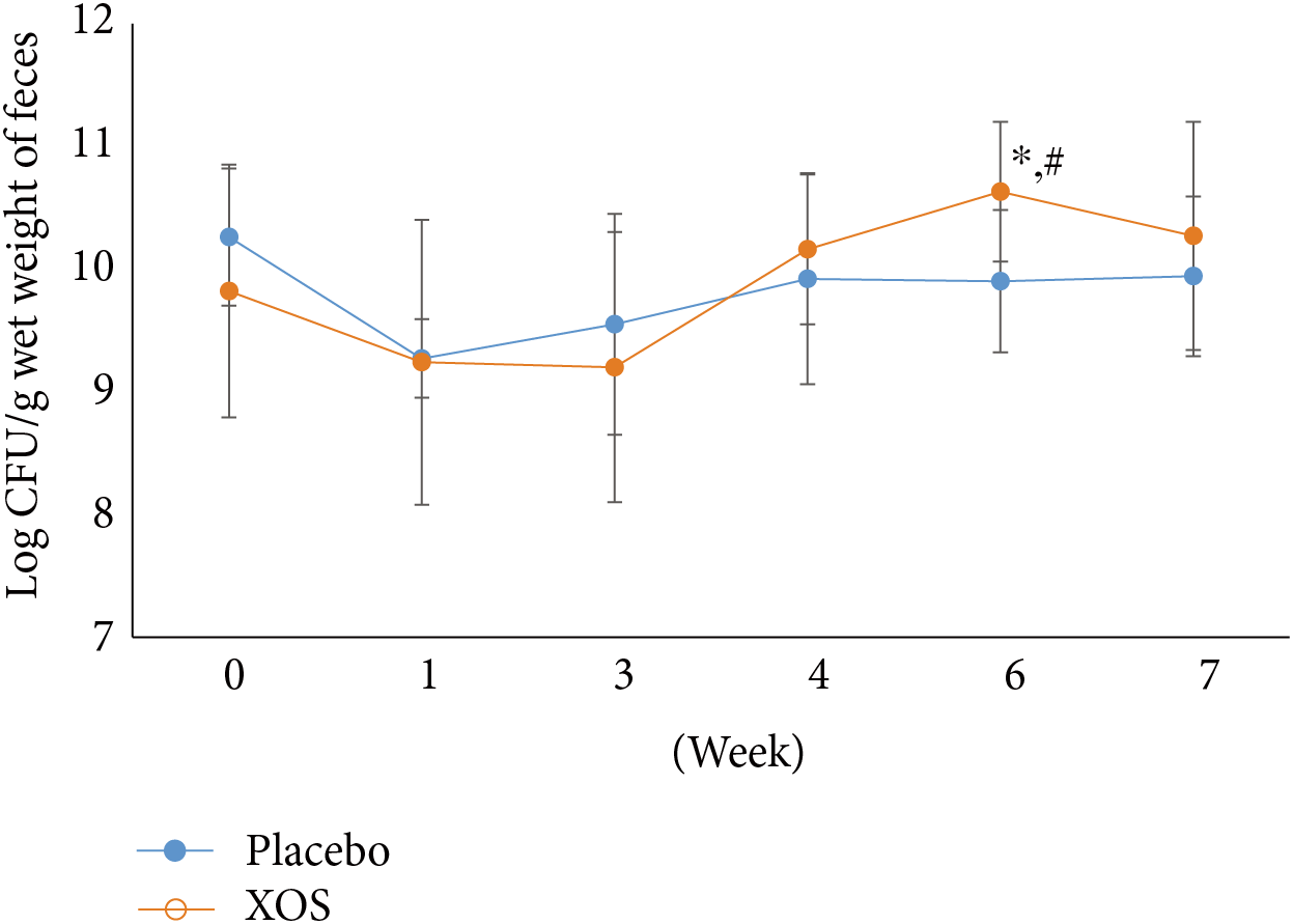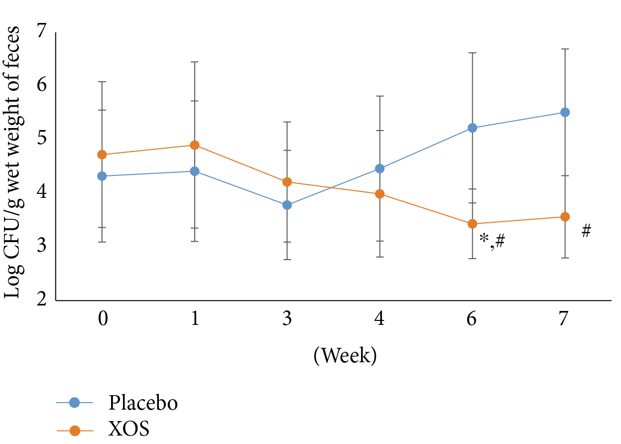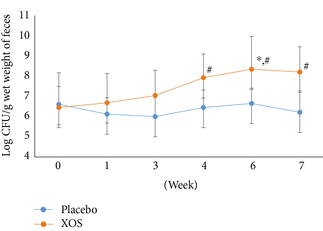 實驗結(jié)果表明,與安慰劑組相比,每天食用含XOS的米粥的6周后,糞便中乳酸桿菌屬及雙歧桿菌屬的細菌數(shù)量顯著上升,產(chǎn)氣莢膜梭菌數(shù)量顯著下降,且糞便細菌總數(shù)量未發(fā)生改變。