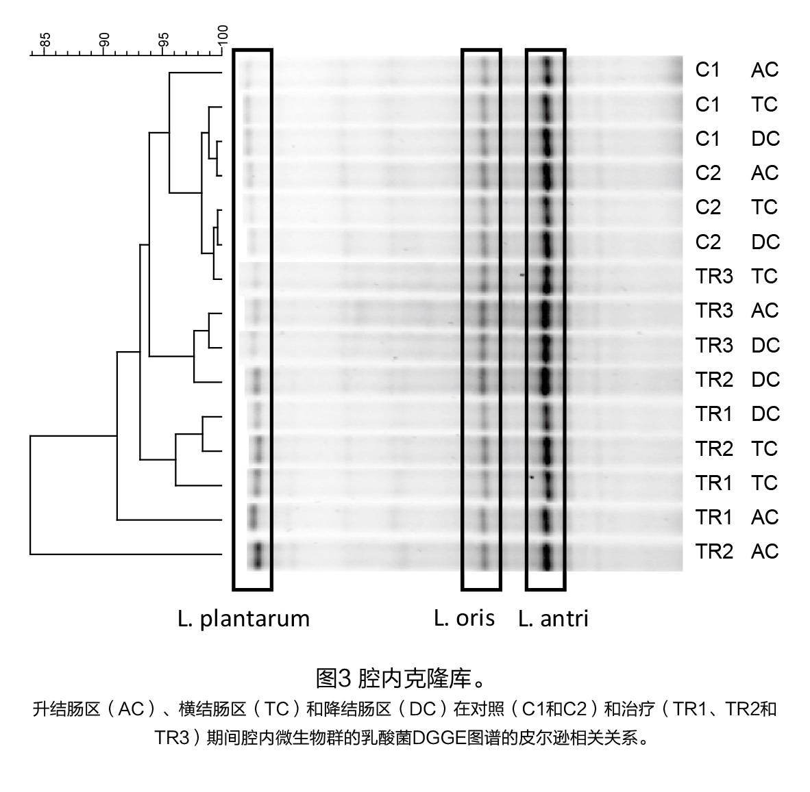 (3)微生物群落組成分析 由表2可知,為了評估試驗樣品對相關(guān)分類群(雙歧桿菌、乳酸菌、嗜粘蛋白-阿克曼菌、擬桿菌和厚壁菌門)的影響,對腔內(nèi)微生物群進行了qPCR分析。在干預(yù)期間,AC和TC的腔內(nèi)環(huán)境中的嗜粘蛋白-阿克曼菌含量增加(AC中從定量限以下到7.15 log/mL,TC中平均為+0.5 log/mL);干預(yù)的第二周和第三周,在AC中其水平升高,而在干預(yù)的第一周,TC中觀察到直接的干預(yù)效果(+0.75 log(或+ 8%))。 試驗樣品干預(yù)后,在AC的腔內(nèi)環(huán)境中,厚壁菌門和擬桿菌門大幅增加,特別是在干預(yù)的第二周和第三周(兩個門至少+1.5 log/mL(+15%);腔內(nèi)厚壁菌門和擬桿菌門水平在TC和DC中不受影響。 經(jīng)過適應(yīng)期后,在干預(yù)的第二和第三周,乳酸菌和雙歧桿菌在AC的腔內(nèi)受到刺激(兩個菌屬都超過了+2.5 log/mL(>30%));在TC中也觀察到乳酸菌屬的腔內(nèi)增加,但沒有AC中那么明顯(+0.4 log/mL)。如圖3所示,腔內(nèi)乳酸菌群落主要由與三個不同物種有關(guān)的操作分類單位(OTU)主導(dǎo),即植物乳桿菌、Lactobacillus oris和Lactobacillus antri;在干預(yù)期間,植物乳桿菌在三個結(jié)腸區(qū)域的相對豐度趨向于增加到19-33%
