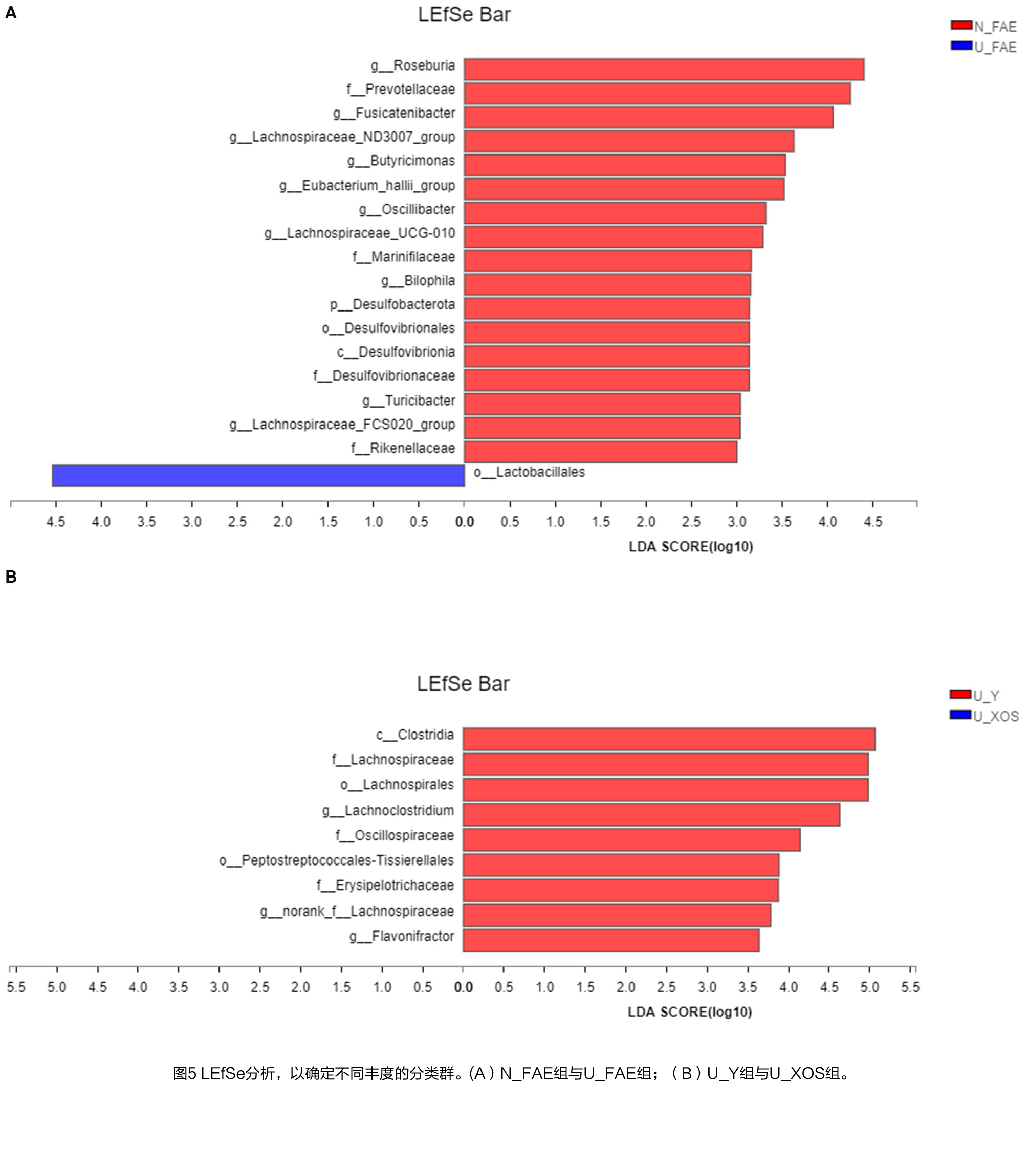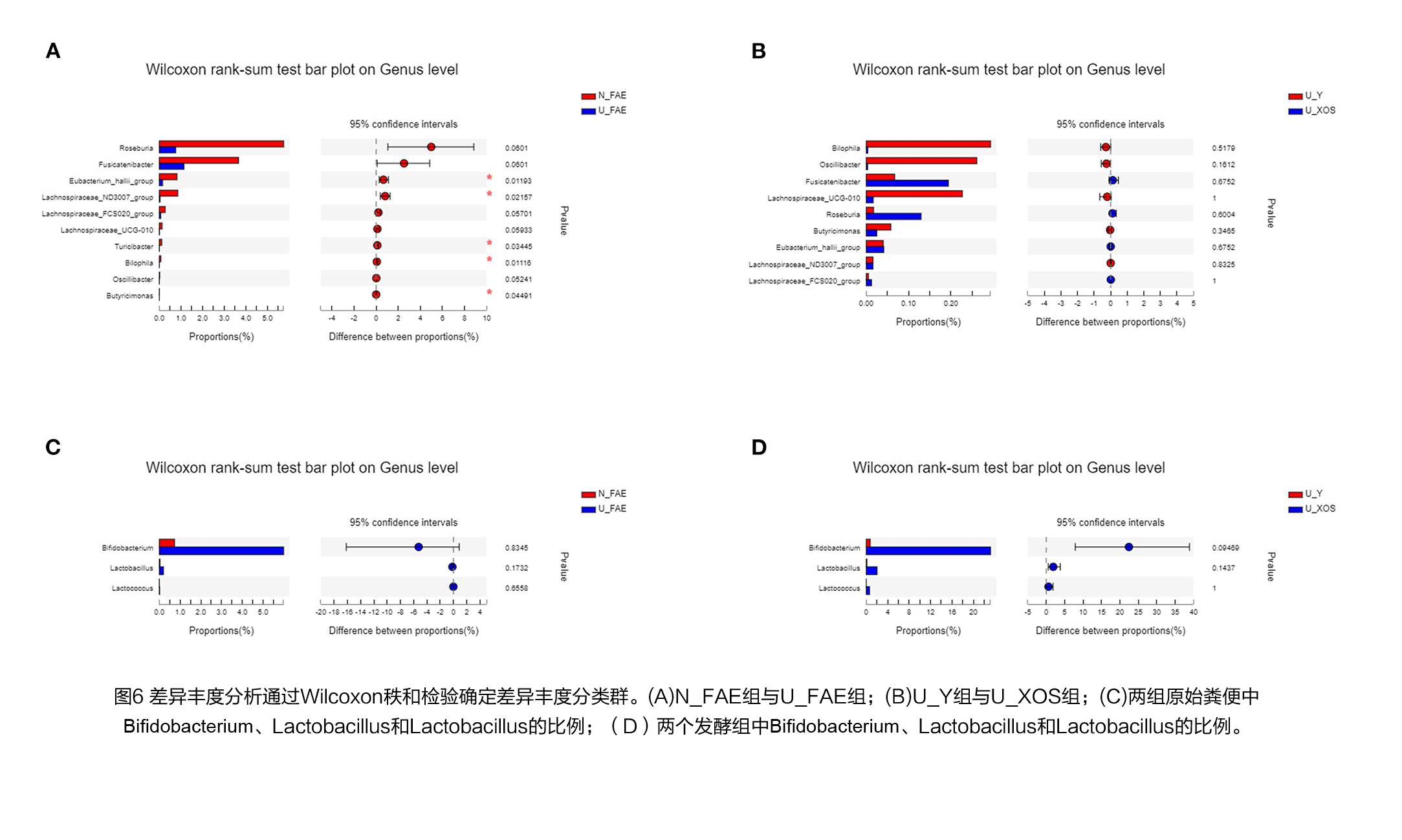 (5)識別不同豐度的分類群 如圖5A所示,G_Roseburia、G_Fusicatenibacter、G_Lachnospiraceae_ND3007_group、G_Butyricimonas、G_Eubacterium_halli_group、G_Oscillibacter、g_Lachnospiraceae_UCG-010、g_Bilophila、g_Turicibacter和g_Lachnospiraceae_FCS020_group的相對豐度在N_FAE組較高,而o_Lactobacillales在U_FAE組較高。如圖6A和6C所示, G_Eubacterium_halli_group、g_Lachnospiraceae_ND3007_group、g_Bilophila、g_Turicibacter和g_Butyricimonas的豐度在N_FAE組較高(P < 0.05),而g_Bifidobacterium、g_Lactobacillus和g_Lactococcus的豐度在U_FAE組較高,但差異不明顯。如圖5B所示,U_Y組中g(shù)_Lachnoclostridium、g_norank_f_Lachnospiraceae和g_Flavonifractor的豐度比U_XOS組高。如圖6B和6D所示, U_XOS組中g(shù)_Roseburia、g_Fusicatenibacter、g_Bifidobacterium和g_Lactobacillus的含量更豐富,而g_Oscillibacter、g_Bilophila和g_Lachnospiraceae_UCG-010的含量較低,但差異不大。此外,在U_XOS組和U_Y組中沒有檢測到g_Turicibacter,這意味著它不能在發(fā)酵環(huán)境中被培養(yǎng)。
