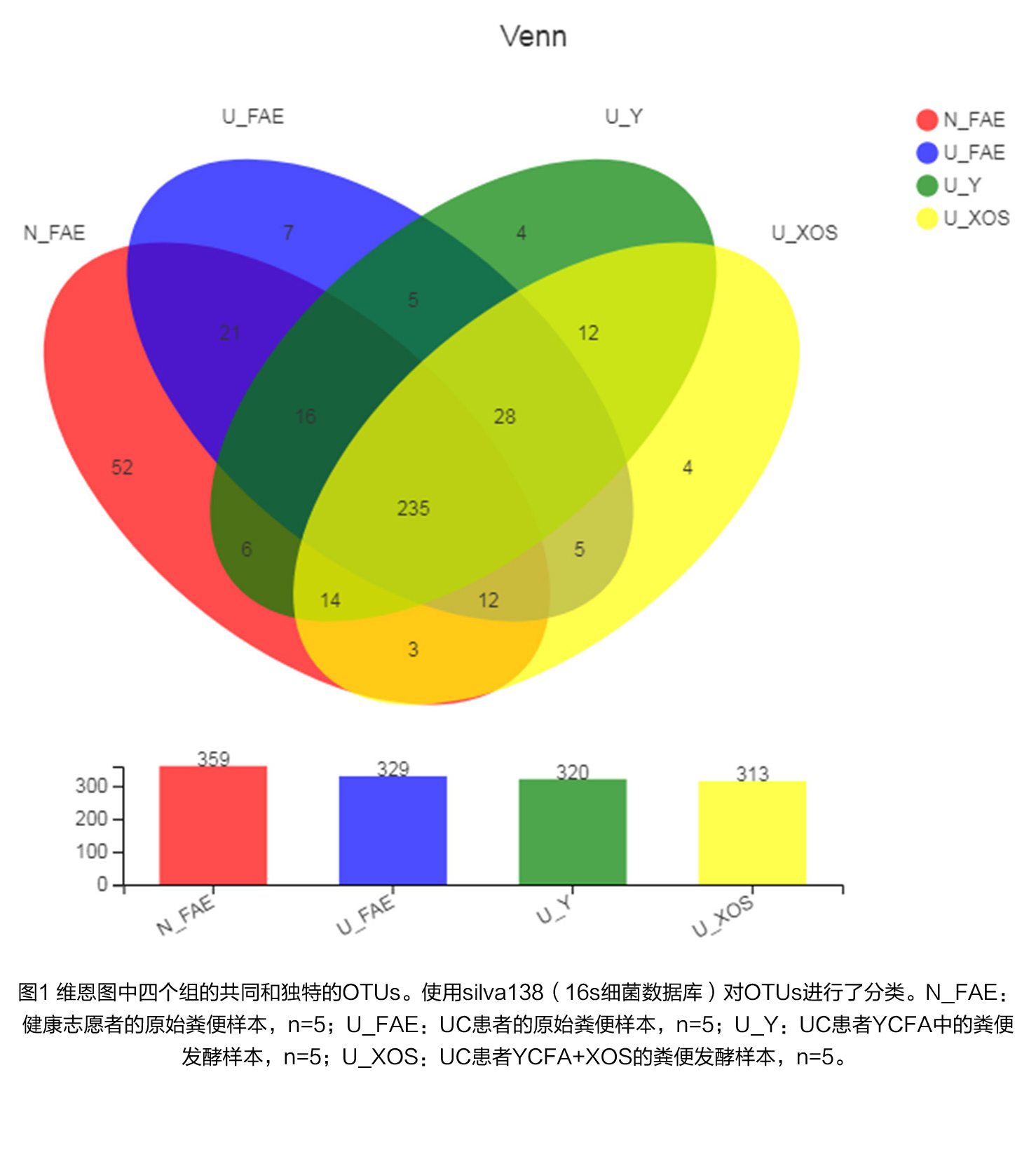 ![]() 試驗設(shè)計 糞便樣本的來源:5名經(jīng)結(jié)腸鏡診斷為臨床緩解期的UC患者和5名健康志愿者,年齡在18至60歲之間,被納入這項病例對照研究。 發(fā)酵培養(yǎng)基:基礎(chǔ)生長培養(yǎng)基(酵母提取物、卡西酮和脂肪酸;YCFA)包含以下化合物:胰蛋白酶,10g/L;酵母提取物,2. 5克/升;L-半胱氨酸,1克/升;NaCl,0.9克/升;CaCl2-6H2O,0.09克/升;KH2PO4,0.45克/升;K2HPO4,0.45克/升;MgSO4-7H2O,0.09克/升;維生素I溶液,200毫升;赫敏溶液,2毫升;加入XOS(Sigma Aldrich,美國)(8克/升)作為唯一的碳源。在加入?yún)捬鯒l件的指示劑后,將培養(yǎng)基調(diào)整到pH值6.5,并將5毫升分裝到一個10毫升的瓶子里,在高壓滅菌器中消毒前用N2沖洗。 靜態(tài)發(fā)酵:采集研究對象新鮮的糞便樣品(0.8克)用8毫升0.1M厭氧磷酸鹽緩沖鹽水(pH7.0)均質(zhì),在糞便樣品到達實驗室后立即制成10%(w/v)的泥漿。 將0.5毫升的糞便漿液接種到裝有5毫升生長培養(yǎng)基(XOS作為唯一的碳源)的消毒瓶中,在37℃下進行厭氧發(fā)酵,發(fā)酵48小時后,對培養(yǎng)基進行離心。將培養(yǎng)基的沉淀物儲存在-80℃,用于提取DNA、測序及生物信息學(xué)分析。UC患者和健康志愿者的原始糞便被定義為U_FAE和N_FAE組的樣本,而UC患者在YCFA和含XOS的培養(yǎng)基中的糞便發(fā)酵沉淀樣本被定義為U_Y和U_XOS組的樣本。 試驗結(jié)果 (1)測序數(shù)據(jù) 如圖1所示,在N_FAE和U_FAE組中分別發(fā)現(xiàn)了359個和329個OTU,而在U_Y和U_XOS組中分別發(fā)現(xiàn)了320和313個OUT;在所有四個組中共檢測到235個核心OUT;另外,N_FAE組有最多的獨特物種(52種),U_FAE、U_Y和U_XOS組中分別有7、4和4個獨特物種;UC患者和健康志愿者的腸道微生物群中大多數(shù)物種可以通過靜態(tài)發(fā)酵進行培養(yǎng),這意味著這種腸道微生物群的體外模擬系統(tǒng)是可行的。