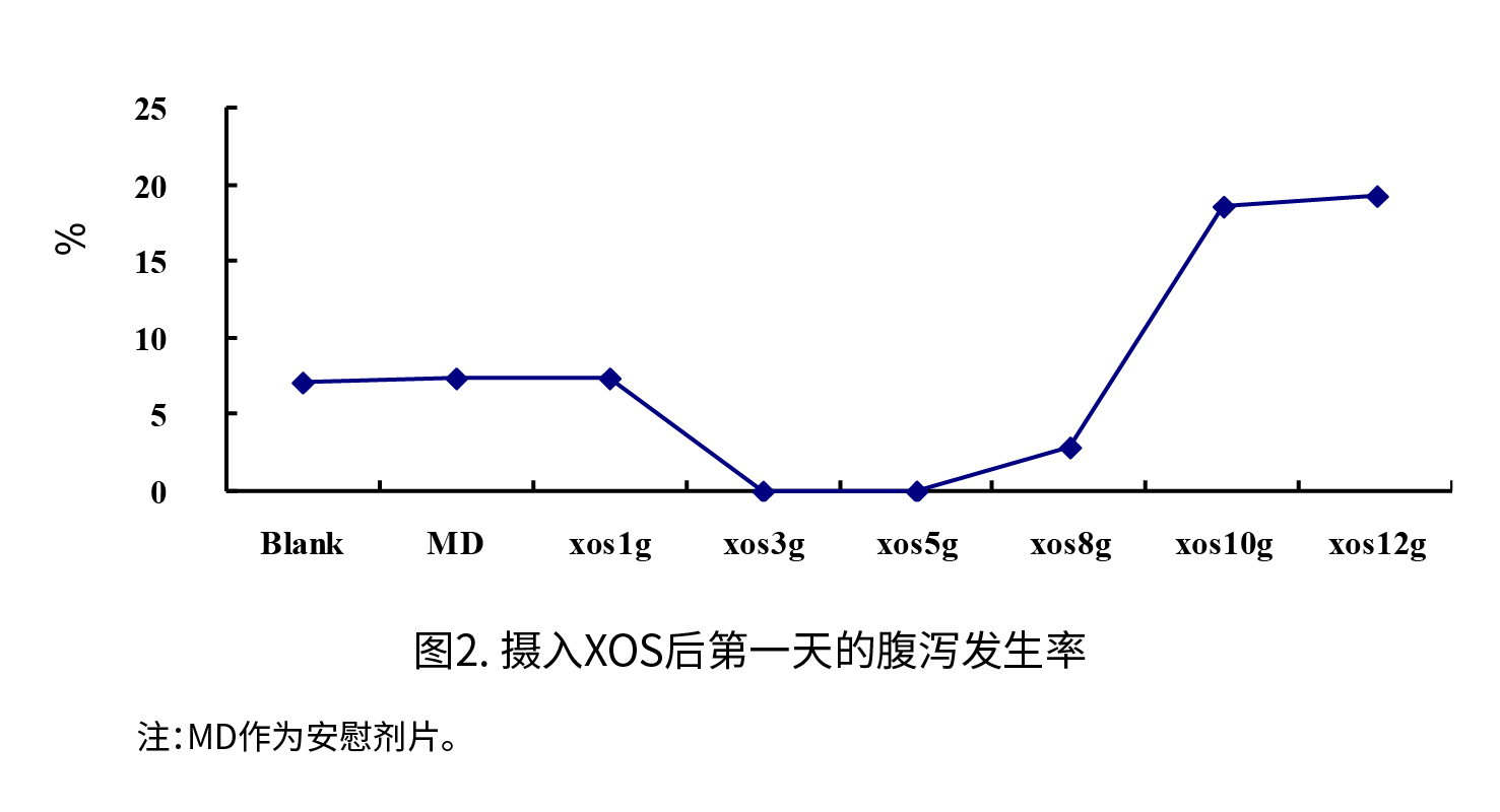 如圖2所示,顯示了第一天服用XOS的受試者發(fā)生腹瀉的情況,如果受試者服用3至5 g XOS,不會發(fā)生腹瀉,但如果服用10 g XOS,腹瀉率則激增至18%,以上結(jié)果說明在服用XOS的過程中,人體的腸胃有一個適應(yīng)的過程,劑量在1至12 g之間,XOS可以通過增加乳酸菌的數(shù)量來改變腸道功能。