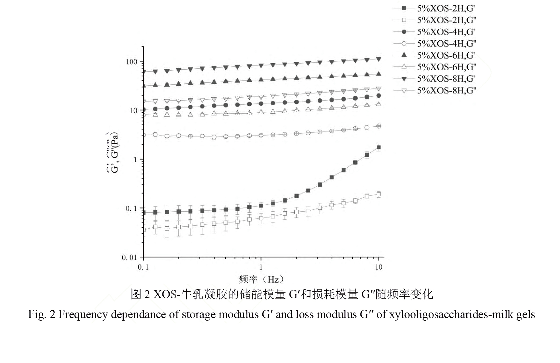 (3)XOS-牛乳凝膠的物性表征 XOS-牛乳凝膠的pH值測定結(jié)果:由表2可知,隨著加熱時間延長,樣品的pH值逐漸降低,由2 h的pH6.60到8 h的pH 5.40。 XOS-牛乳凝膠的凝膠強度測定結(jié)果:由表2可知,隨著加熱時間延長,樣品的凝膠強度逐漸增大,反應時間由2 h延長至8 h,凝膠強度從22.7 g提高至144.4 g。 XOS-牛乳凝膠的持水力測定結(jié)果:由表2可知,加熱初期凝膠的持水力增加,而加熱時間由6 h增至8 h,凝膠樣品持水力由53.1%降低至49.1%。 XOS-牛乳凝膠的色度測定結(jié)果:由表2可知,凝膠樣品的L*隨反應時間的延長而降低,同時a*值、b*值及BI值逐漸升高,凝膠樣品的顏色隨美拉德反應時間延長而逐漸變深,色度中的紅色及黃色占比逐漸提高,賦予凝膠樣品棕黃色的顏色特征。 XOS-牛乳凝膠的流變學性質(zhì):由圖2可知,隨著反應時間的延長,XOS-牛乳凝膠樣品在震蕩頻率為0.1 Hz時儲能模量G′明顯增大,由加熱2 h時1.7 Pa提高至8 h的61.3 Pa(P<0.05),XOS-牛乳凝膠樣品的模量隨頻率改變而發(fā)生變化,表現(xiàn)為弱凝膠的特點。