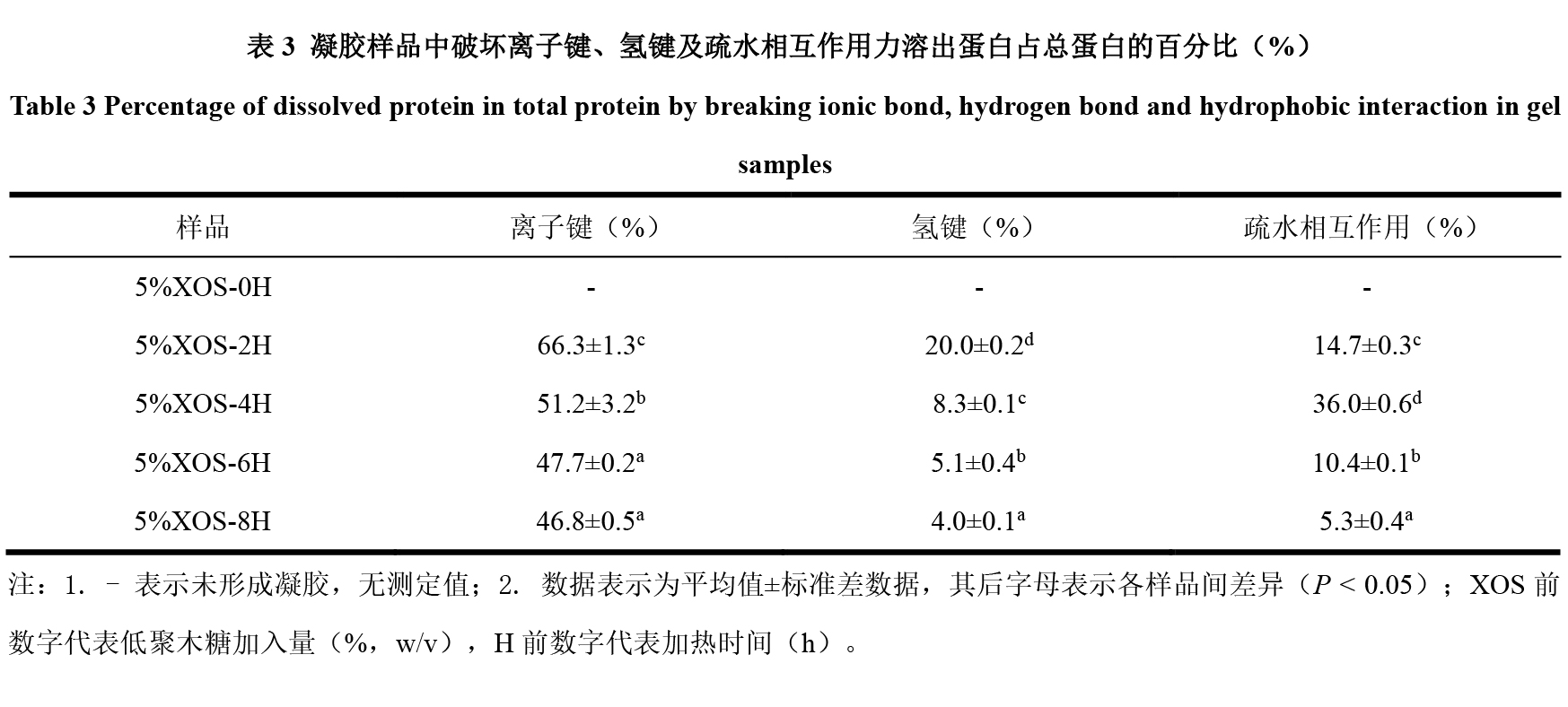 (4)XOS-牛乳凝膠形成機制 XOS-牛乳凝膠溶解度分析:由表3可知,各凝膠樣品中,離子鍵的貢獻最大,但其作用逐漸減弱, 反應4 h的51.2%降低到6 h的47.7%,繼續(xù)加熱無明顯變化;氫鍵和疏水相互作用對美拉德反應誘導XOS-牛乳凝膠結(jié)構(gòu)形成的貢獻相對較?。?.0%-20.0%和 5.3%-36.0%),且氫鍵的貢獻隨加熱時間延長而減??;疏水相互作用的貢獻隨加熱時間延長先增大后減弱,在4 h達到最大值 36.0%。