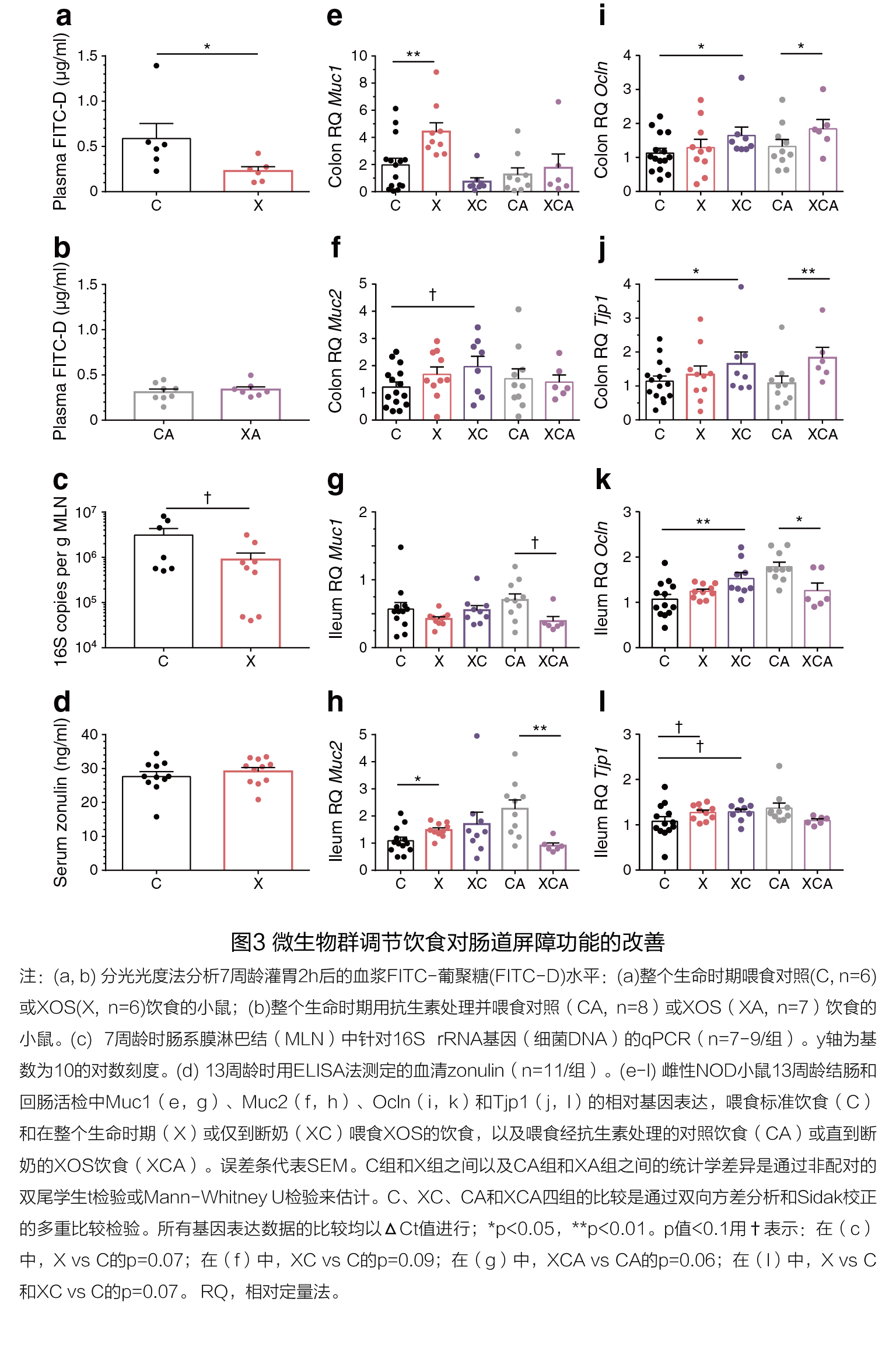 (3)抗生素減少腸道微生物群 如圖2j所示,通過(guò)16S rRNA基因(V3區(qū)域)qPCR發(fā)現(xiàn)抗生素可使16S的總拷貝數(shù)減少4000倍以上;擴(kuò)增子測(cè)序表明飲食組中剩余的少數(shù)細(xì)菌主要由鏈球菌屬組成,達(dá)到擴(kuò)增子豐度的98%(±1%)(圖2f);此外,與對(duì)照組(0%)抗生素處理的小鼠相比,只有一個(gè)豐度很低的屬即黃桿菌屬,在XOS喂食的小鼠(占剩余微生物組的0.1%)顯著升高(圖2g);這種低豐度分類群的單一差異是導(dǎo)致兩個(gè)飲食組在未加權(quán)PCoA圖中單獨(dú)聚類的主要原因:P<0.05, R2= 0.086(圖2c);因此在加權(quán)PCoA圖中無(wú)法觀察到差異:P=0.17,R2= 0.17(圖2d),綜合來(lái)看,數(shù)據(jù)表明XOS對(duì)胰腺炎有直接的微生物群獨(dú)立性影響。 (4)益生元對(duì)腸道屏障功能和粘膜炎癥的改善 如圖3a所示,與喂養(yǎng)對(duì)照組飲食的小鼠相比,喂養(yǎng)XOS小鼠的屏障滲透性確實(shí)較低;圖3c顯示腸系膜淋巴結(jié)中16S rRNA基因的qPCR也證實(shí)了這一點(diǎn),顯示與對(duì)照組小鼠相比,喂食XOS的小鼠中能夠穿過(guò)腸道屏障并到達(dá)引流淋巴結(jié)的微生物較少;如圖3e、3h所示,與黏液相關(guān)的基因在低聚木糖(XOS)組小鼠回腸(Muc2)和結(jié)腸(Muc1)中也表達(dá)上調(diào);圖3i-l顯示,其他屏障相關(guān)基因,如Ocln和Tjp1(分別編碼閉鎖素和緊密連接蛋白1)在早期喂食低聚木糖(XOS)的小鼠回腸和結(jié)腸中均顯著上調(diào)。圖3i-j結(jié)果表明在生命早期補(bǔ)充XOS似乎以獨(dú)立于微生物的方式調(diào)節(jié)這些部分的屏障功能,因?yàn)檫@種差異在抗生素處理的小鼠中持續(xù)存在。 如圖3b所示,代表回腸屏障功能的FITC-葡聚糖試驗(yàn)以及圖3k、3l回腸組織中的基因表達(dá)都沒有顯示出抗生素處理小鼠的屏障得到改善;圖3d表明兩個(gè)飲食組的血清中該蛋白的水平是相似的。