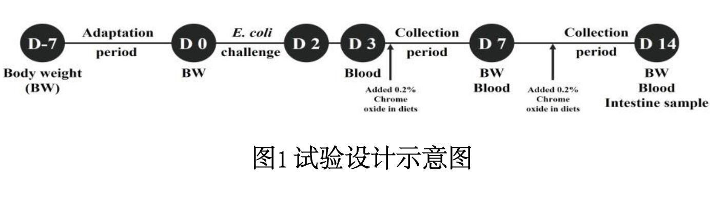 試驗(yàn)?zāi)康?/span> 本研究的目的是確定在斷奶豬口服致病性大腸桿菌時(shí),添加刺激素(STB)對(duì)生長(zhǎng)性能、免疫反應(yīng)和炎癥反應(yīng)的影響。 試驗(yàn)設(shè)計(jì) 選擇36頭28日齡(初始體重為8.49±0.10 kg)雄性斷奶仔豬,,進(jìn)行為期3周的試驗(yàn),其中預(yù)試驗(yàn)7d,正式試驗(yàn)期14d(下文所述的試驗(yàn)開(kāi)始后天數(shù)均為正式試驗(yàn)期內(nèi))。試驗(yàn)采用2×3因子排列,36頭斷奶仔豬被分配到6個(gè)處理,每個(gè)處理6個(gè)重復(fù)。處理包括兩個(gè)水平的挑戰(zhàn)(挑戰(zhàn)和非挑戰(zhàn))和三個(gè)水平的STB(0、0.5和1 g/kg日糧)。玉米和豆粕基礎(chǔ)日糧的配方見(jiàn)表1。圖1描述了本研究中使用的斷奶仔豬試驗(yàn)設(shè)計(jì)的示意圖。