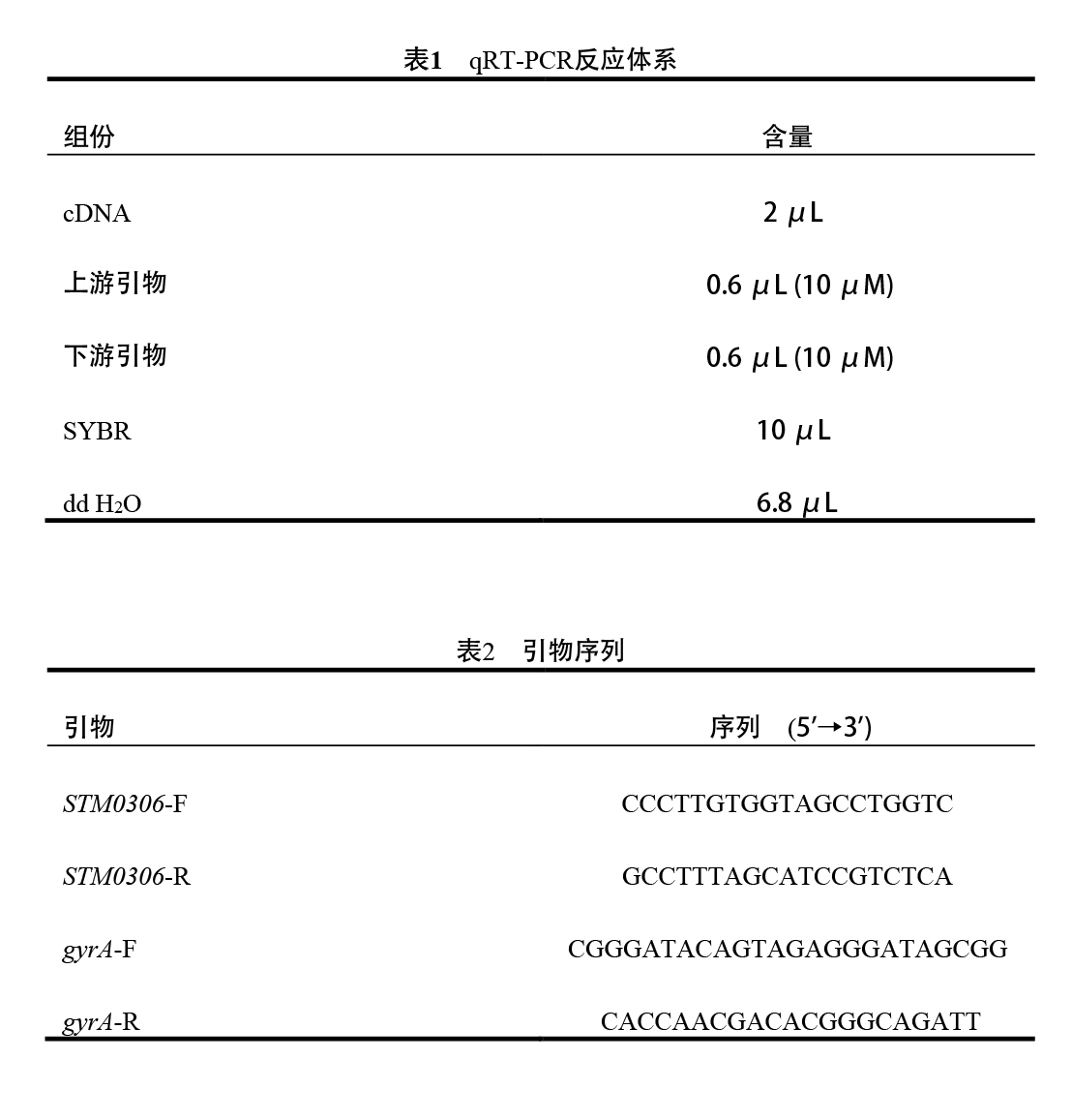 試驗(yàn)設(shè)計(jì) 細(xì)菌黏附能力的測(cè)定: ①XOS、細(xì)菌、細(xì)胞共孵育黏附試驗(yàn):在12孔細(xì)胞培養(yǎng)板中接種IPEC-J2細(xì)胞,置于5% CO2,37℃恒溫培養(yǎng)箱中培養(yǎng),待細(xì)胞生長(zhǎng)至約90%時(shí),更換培養(yǎng)基,加入PBS洗滌三次后的處于對(duì)數(shù)生長(zhǎng)期的鼠傷寒沙門(mén)氏菌菌液(1×109 CFU/mL,MOI=100),同時(shí)在培養(yǎng)基中加入XOS至終濃度為20 mg/mL,對(duì)照組加入等體積PBS,37℃孵育1 h后PBS洗滌三次以去除未黏附的細(xì)菌,加入1 mL 1%Triton-100常溫30 min裂解細(xì)胞,將細(xì)胞裂解液充分吹打混勻后進(jìn)行倍比稀釋,通過(guò)瓊脂平板倒板法進(jìn)行菌落計(jì)數(shù),計(jì)算黏附細(xì)菌總數(shù)量。 ②XOS預(yù)處理細(xì)菌、細(xì)胞黏附試驗(yàn):黏附試驗(yàn)方法同上,鼠傷寒沙門(mén)氏菌與IPEC-J2細(xì)胞均用20 mg/mL XOS進(jìn)行預(yù)處理,處理方法如下:細(xì)菌預(yù)處理:在細(xì)菌培養(yǎng)過(guò)程中加入終濃度為20 mg/mL的XOS溶液,對(duì)照組加入等體積PBS,置于37℃空氣搖床培養(yǎng)至對(duì)數(shù)生長(zhǎng)期,進(jìn)行后續(xù)處理;細(xì)胞預(yù)處理:待12孔細(xì)胞培養(yǎng)板中的細(xì)胞生長(zhǎng)至約80%時(shí),棄培養(yǎng)基并用PBS洗滌細(xì)胞一次,加入新鮮培養(yǎng)基,并加入終濃度為20 mg/mL的XOS溶液,對(duì)照組加入等體積PBS,輕搖混勻后置于5% CO2,37℃恒溫培養(yǎng)箱中培養(yǎng),待細(xì)胞生長(zhǎng)至約90%時(shí)進(jìn)行后續(xù)處理。 qRT-PCR:培養(yǎng)鼠傷寒沙門(mén)氏菌并用20 mg/mL XOS對(duì)菌液進(jìn)行處理,對(duì)照組加入等體積PBS,待細(xì)菌處于對(duì)數(shù)生長(zhǎng)期,通過(guò)BIOG細(xì)菌RNA提取試劑盒提取鼠傷寒沙門(mén)氏菌總RNA并進(jìn)行逆轉(zhuǎn)錄后,采用如表1所示體系進(jìn)行qRT-PCR,以鼠傷寒沙門(mén)氏菌DNA消旋酶亞基基因gyrA(DNA gyrase subunit A)作為內(nèi)參,對(duì)獲得的信號(hào)、數(shù)據(jù)進(jìn)行處理,根據(jù)公式2-△△Ct計(jì)算目的基因相對(duì)于內(nèi)參基因的比值以反映其表達(dá)豐度,引物信息見(jiàn)表2。 ![]() pH測(cè)定:培養(yǎng)鼠傷寒沙門(mén)氏菌并添加20 mg/mL XOS溶液,置于37℃空氣搖床220 r/min培養(yǎng),每隔2 h測(cè)定一次細(xì)菌培養(yǎng)液的pH,測(cè)定前將菌液進(jìn)行離心以分離菌體與培養(yǎng)液。 Mg2+濃度測(cè)定:培養(yǎng)鼠傷寒沙門(mén)氏菌并添加20 mg/mL XOS溶液,置于37℃空氣搖床220 r/min培養(yǎng),每隔2 h測(cè)定一次培養(yǎng)液中的Mg2+濃度,離心后通過(guò)鎂濃度檢測(cè)試劑盒(微量法)測(cè)定Mg2+濃度。 試驗(yàn)結(jié)果 (1)XOS共孵育對(duì)鼠傷寒沙門(mén)氏菌黏附IPEC-J2細(xì)胞的影響 由圖1可知,與未加XOS組相比,XOS共孵育能夠極顯著(P<0.01)抑制鼠傷寒沙門(mén)氏菌對(duì)IPEC-J2細(xì)胞的黏附,在共孵育處理體系中,XOS、鼠傷寒沙門(mén)氏菌和IPEC-J2細(xì)胞三者同時(shí)存在,表明XOS能通過(guò)影響鼠傷寒沙門(mén)氏菌與IPEC-J2細(xì)胞之間的互作來(lái)抑制其對(duì)細(xì)胞的黏附作用。