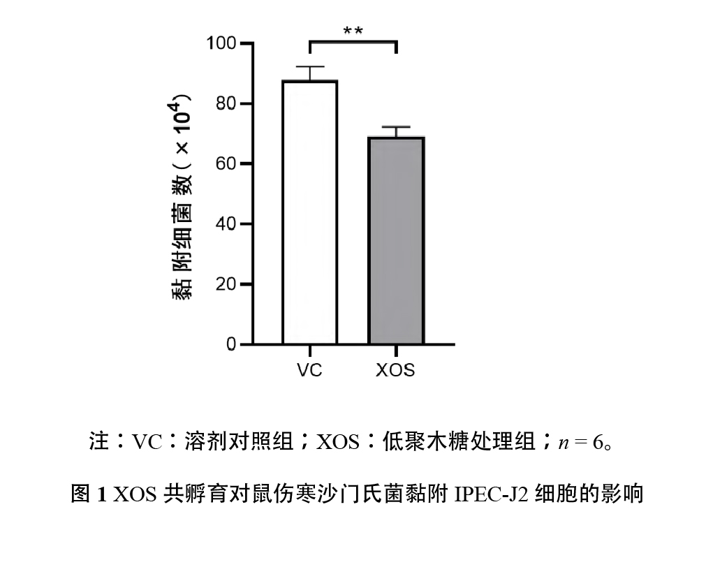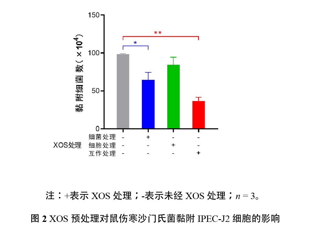 (2)XOS預(yù)處理對(duì)鼠傷寒沙門(mén)氏菌黏附IPEC-J2細(xì)胞的影響 由圖2可知,與未加XOS組相比,XOS預(yù)處理的鼠傷寒沙門(mén)氏菌對(duì)IPEC-J2細(xì)胞的黏附能力顯著降低(P<0.01);XOS預(yù)處理IPEC-J2細(xì)胞組雖然未達(dá)到顯著性(P>0.05),但是黏附細(xì)菌數(shù)量在數(shù)值上有一定的降低;另外設(shè)置共孵育處理組,結(jié)果與(1)相同,表明除了參與細(xì)菌與細(xì)胞間的互作外,XOS還能夠通過(guò)影響鼠傷寒沙門(mén)氏菌本身從而抑制其對(duì)細(xì)胞的黏附能力。
