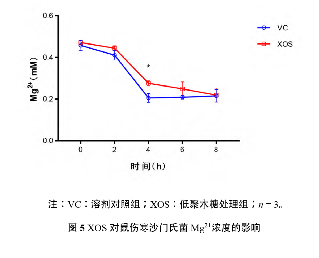 (5)XOS對(duì)鼠傷寒沙門(mén)氏菌Mg2+濃度的影響 由圖5可知,XOS處理組培養(yǎng)基中的Mg2+濃度在2~6 h均低于對(duì)照組,且在4 h達(dá)到了顯著性(P<0.05),表明XOS可能通過(guò)影響細(xì)菌培養(yǎng)環(huán)境的pH值和Mg2+濃度調(diào)控PhoP/PhoQ雙組份系統(tǒng)的活性,進(jìn)而影響下游STM0306基因的表達(dá)。
