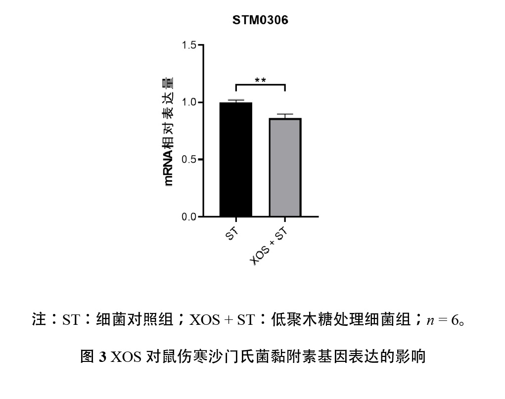 (3)XOS對(duì)鼠傷寒沙門(mén)氏菌黏附素基因表達(dá)的影響 由圖3可知,通過(guò)基因篩選,我們發(fā)現(xiàn)XOS極顯著(P<0.01)下調(diào)了鼠傷寒沙門(mén)氏菌黏附素STM0306基因的mRNA相對(duì)表達(dá)量(無(wú)顯著性變化的基因結(jié)果未展示),表明XOS可能通過(guò)影響鼠傷寒沙門(mén)氏菌STM0306基因表達(dá)進(jìn)而影響其的黏附能力。